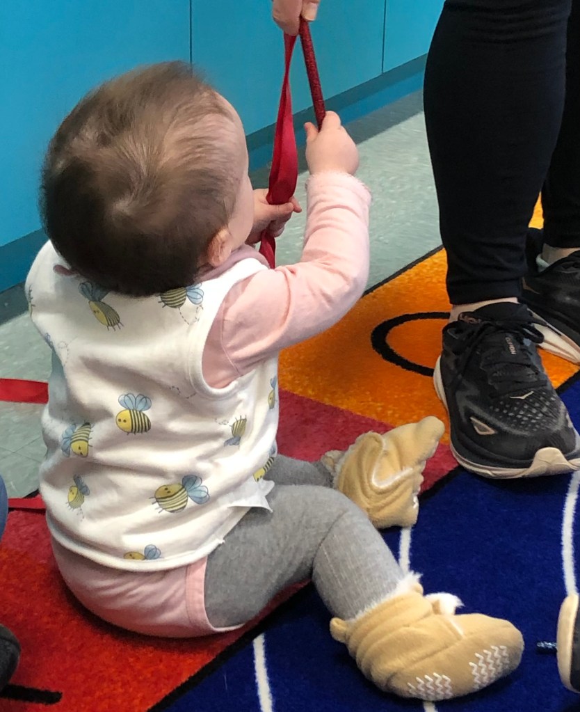 My daughter and her husband wanted our baby to start socializing in a group and they thought a music a activity would fit them bill. I found a baby music time at my local library for ages three months to two years so we started signing up for that once a week. The program consisted of a variety of simple songs with finger plays such as Skidermarink, and whole body movements such as Row, Row, Row your Boat. There were songs to go with shakers an songs to go with ribbons and a short board book story before the song of goodbye at the end. My granddaughter loved it. At first she was on my lap with me doing everything for her. Gradually, over the months as she grew physically stronger and was able to sit up more, she took over some of the movements and especially loved the shaker and waving the ribbons. The ribbon was her favorite although sometimes she spent more time chewing on the stick rather than waving the ribbon. Some songs had a lot of clapping. My granddaughter stared hard at the librarian leading the group as she clapped and didn’t she start clapping at home at around 5 months? The first time I saw her clap her hands together she startled in surprise and then smiled in delight and tried to do it again and again.