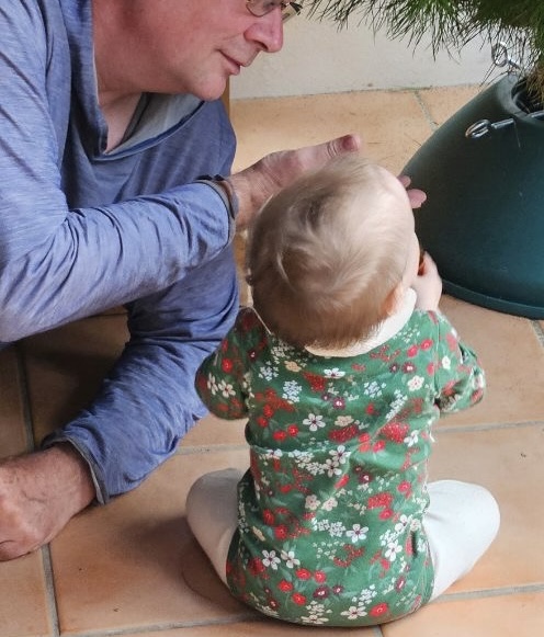Now that my granddaughter can reach for things, there are new toys for her to build her fine motor skills gaining more control every day. I found a lovely wooden Montessori toy in the local thrift store of pastel wooden shapes that slot over wooden pegs. My granddaughter is able to lift some of the pieces off the pegs. Of course then go straight into her mouth, but it’s all growth in her expanding world. There’s a lot going on in her brain with her focus on her goal of getting each shape free and coordinating her arms, hands and fingers. She looks very pleased with herself.
