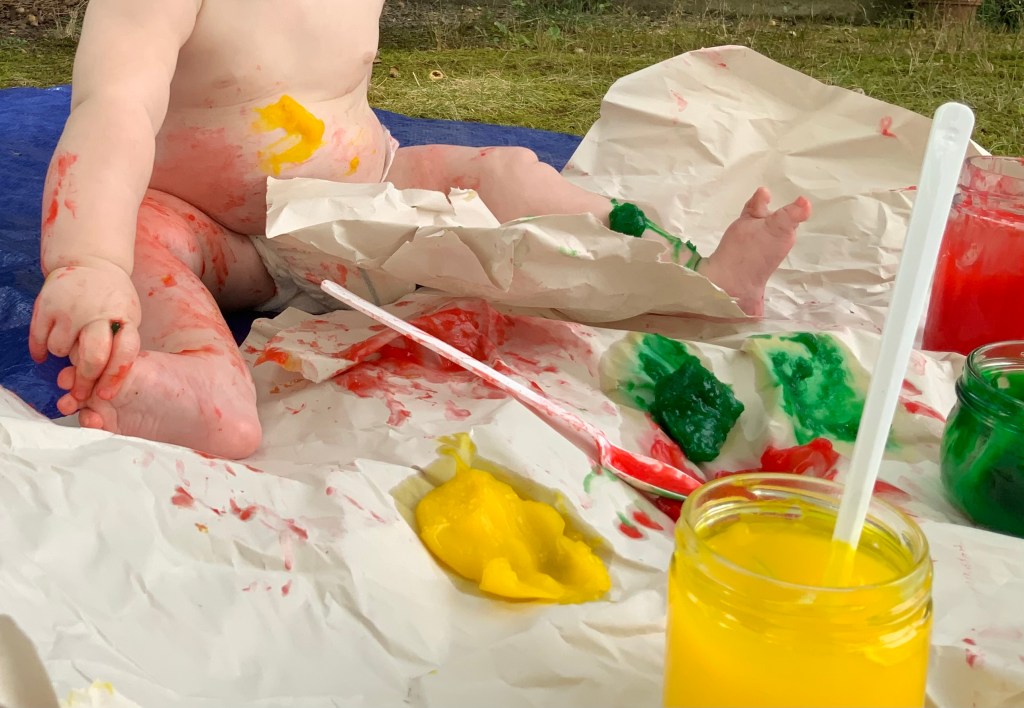 Art activities are so much fun! And of course they are terrifying in their potential for messiness. A careful preparation and a bit of forethought can go a long way. It’s not easy to be successful in the moment. I really enjoy mixing finger paints and setting up a mostly undressed baby either in the high chair or on the ground with paint and paper to play with.